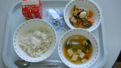 今日の献立は,「麦ごはん・牛乳・プリプリ中華いため・豆腐と青菜のスープ・じゃこ」でした。