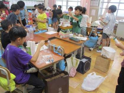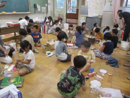 もう何回か遊びを重ねているので、最後の振り返りでは「同じくらいの大きさの箱を積むと倒れにくかった」や、「形がしっかりしていないものは横にすると積むことができた」など素材の不思議さに気が付いている子どももいました。