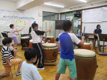 今週も先週に引き続き、全体の流れ・繋がりを意識して練習を行いました。「太鼓の中心を叩く時は力強く、ふちを叩く時には軽く」という先生からのアドバイスを意識している子が多くいました。