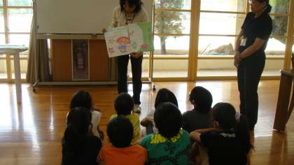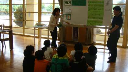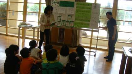 最初に絵本を読みました。その後,緑の食べ物の働きについて知らせました。