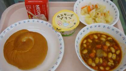 今日の献立は,「バターうずまきパン・牛乳・チリコンカーン・野菜のホットマリネ・プリン」でした。