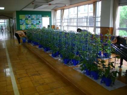 台風が接近・通過した際に,倒れないようにと,朝顔の鉢を校舎内に「一時避難」させています。