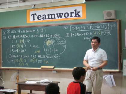 6年生の算数では今,「比とその利用」という学習をしています。 今日は,比の性質を利用して,横の長さが12cmの長方形のもう一方の辺の長さを求める方法をみんなで考えました。