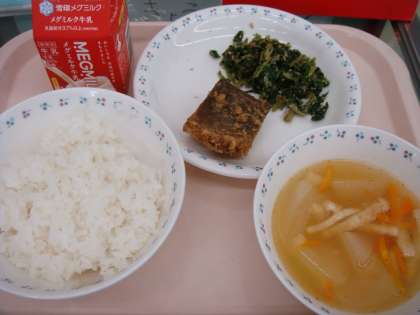 今日の献立は,「ごはん・牛乳・ほっけのたつたあげ・大根葉のごまいため・とうがんのくずひき」でした。