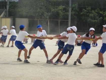 今日の4年生の体育では,棒引きの練習を行いました。4色のグループに分かれて棒を引きあう様子を見ていると,見ている側も力が入ります。子どもたちは自分たちなりに作戦を考えてがんばっているようです。