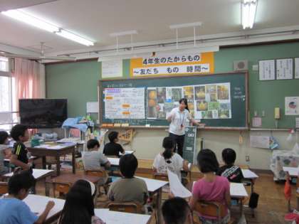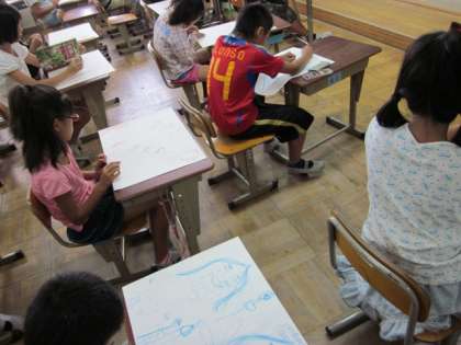 4年生の図工では,今,お話の絵に取り組んでいます。1組では「妖精めがね,さしあげます」,2組では「エレベーターのひみつのとびら」というお話を読んで,イメージをひろげて絵にしています。