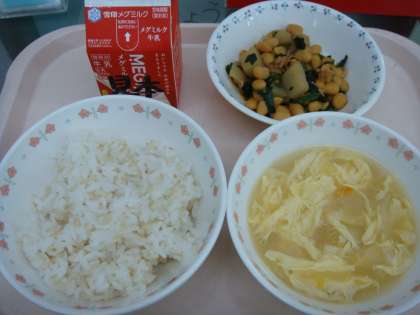 今日の献立は,「玄米ごはん・牛乳・肉みそいため・中華コーンスープ」でした。