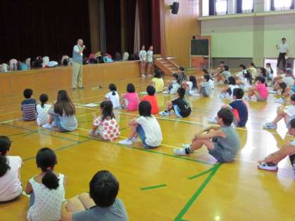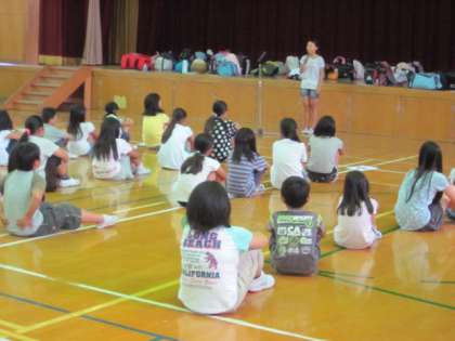 子どもたちが楽しみにしていた「学校キャンプ」が始まりました。校門をくぐってきた子どもたちはみんなにこにこ顔でした。大人がだれもいない体育館では,実行委員の6年生が中心になってやってきた子どもたちのお世話をしてくれていました。
