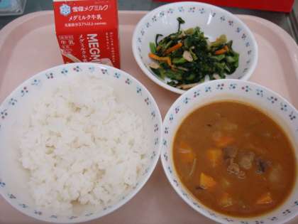 今日の献立は,「ごはん・牛乳・ビーフシチュー・小松菜のソティ」でした。