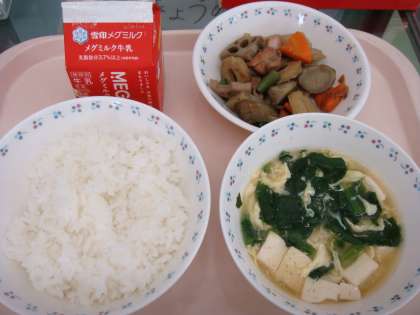 今日の献立は,「ごはん・牛乳・筑前煮・かきたま汁」でした。