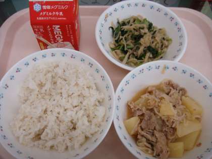 今日の献立は,「麦ごはん・牛乳・肉じゃが(ピリカラみそ味)・小松菜と切干大根の煮びたし」でした。
