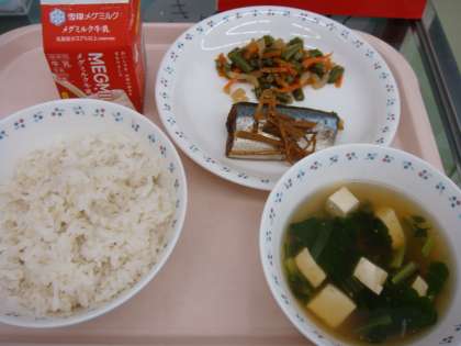 今日の献立は,「麦ごはん・牛乳・さんまのしょうが煮・野菜のきんぴら・とうふの吉野汁」でした。
