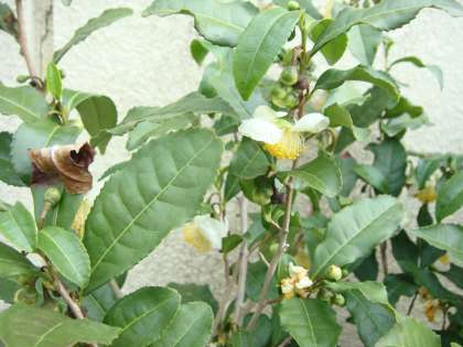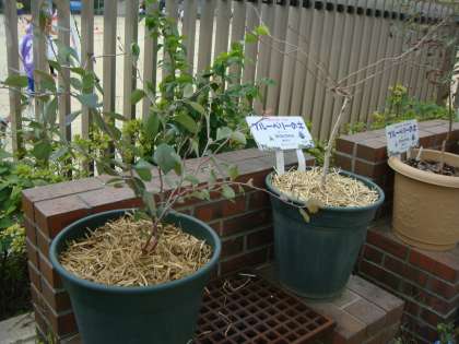上から,3年生の九条ねぎ・4年生のブルーベリー・5年生のお茶の木(花がさいています)です。