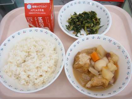 今日の献立は,「玄米ごはん・牛乳・関東煮・大根葉のごまいため」でした。
