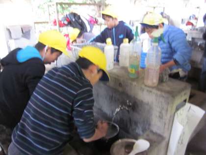調理係の後片付けの様子です。水の冷たさにも負けず,本当に一生懸命に働く子どもたちを見ていて感動してしまいました。 真っ黒の鍋がぴかぴかになった様子をご覧ください。