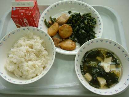 今日の給食は,「麦ごはん・牛乳・平天とこんにゃくの煮つけ・ほうれん草のおかか煮・とうふの吉野汁」です。