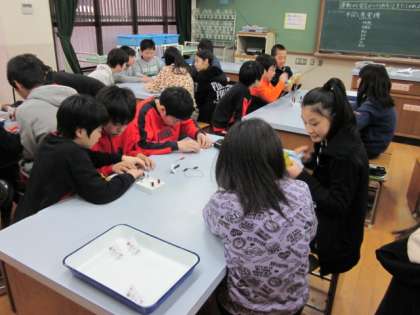 今,6年生の理科では「電気の性質とはたらき」という学習をしています。今日は手回し発電機を使ってコンデンサーに電気を蓄え,豆電球と発光ダイオードとの違いを調べました。自分たちでおこした電気でついた豆電球を見て,子どもたちは大喜びでした。