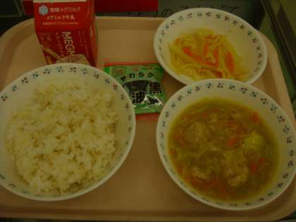 今日の献立は,「麦ごはん・牛乳・肉だんごのスープ煮・じゃがいものピリカラいため・黒大豆」でした。