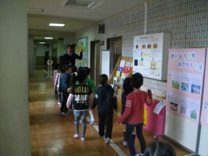 今日は,給食室や保健室の前を通って学校内を見て回りました。