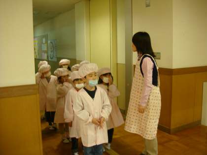 給食室に入る前に「いただきます」とあいさつをします。