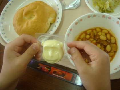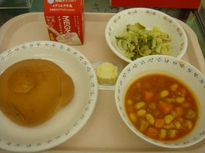 今日の献立は,「バターうずまきパン・牛乳・ポークビーンズ・ツナとキャベツのソティ・型チーズ」でした。