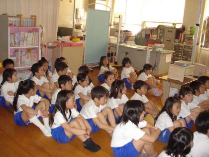 2年生の身体計測でした。トイレのスリッパをそろえようというお話やトイレや手洗い場のルールをお話しました。よい姿勢でしっかりお話を聞いていました。