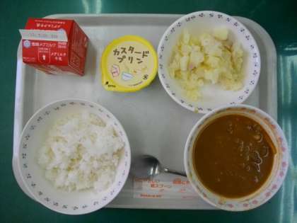 今日の献立は,「ごはん・牛乳・ハッシュドビーフ・ジャーマンポテト・プリン」でした。