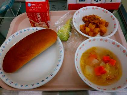 今日の献立は,「黒糖コッペパン・牛乳・豚肉のケチャップ煮・野菜のスープ煮・メロン」でした。