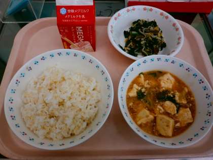 今日の献立は,「麦ごはん・牛乳・マーボ豆腐・ほうれん草ともやしのいためナムル」でした。