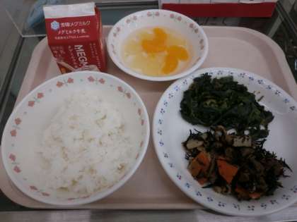 今日の献立は,「ごはん・牛乳・牛肉とひじきのいため煮・ほうれん草のおかか煮・フルーツ寒天」でした。