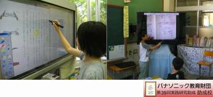 左の写真は,電子黒板に教科書の文を映して,注目したいキーワードに線をひいているところです。聞いているお友達は,発表者の伝えたいキーワードを目で見て確認することができます。