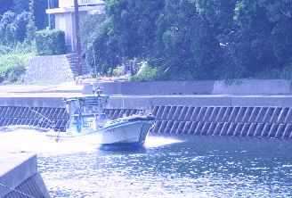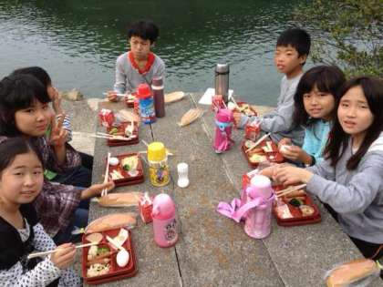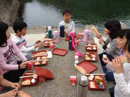 7時30分から,深谷水道(ふかやすいどう)を眺めながら朝食を食べています。深谷水道は,三重県志摩市にある英虞湾と太平洋を結ぶ運河のことです。