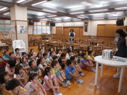 給食前に「水分とってますか?」をテーマに『アマアマ星人の侵略』という話をしました。のどがかわいたら,水分をとることが大切なことや,清涼飲料を飲みすぎないためのポイントなどについて学習しました。