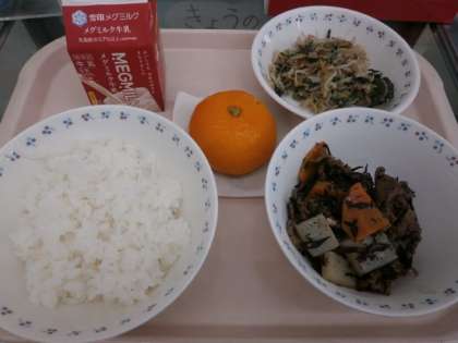 ごはん・牛乳・牛肉とひじきのいためもの・もやしと小松菜のごまいため・みかん