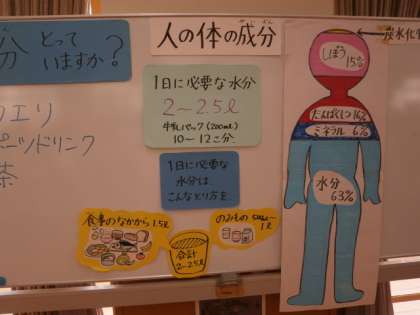 その体の水分量は,年齢によって違うこと,体の中での「水分の役割」や1日に必要な水分の量(2〜2.5リットル)をどうしてとるかについても考えました。