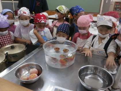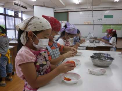 子どもたちがむいたトマトを使って「トマトソース」を作りました。