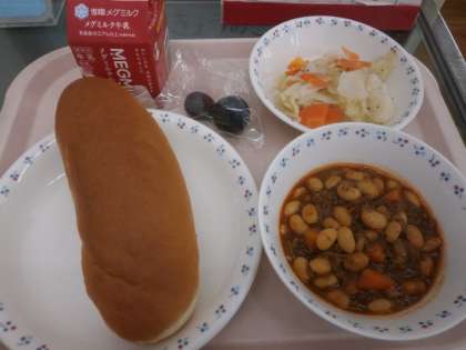 あじつけコッペパン・牛乳・チリコンカーン・野菜のホットマリネ・ぶどう