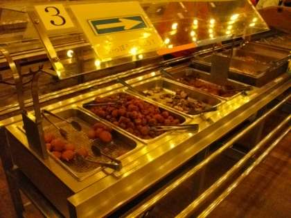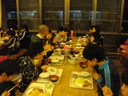 夕食は食堂でバイキング形式でいただきました。野菜の煮つけやハンバーグ、サラダ、八宝菜など、たくさんのの献立を用意していただきました。たこやきもあり、大変人気がありました。