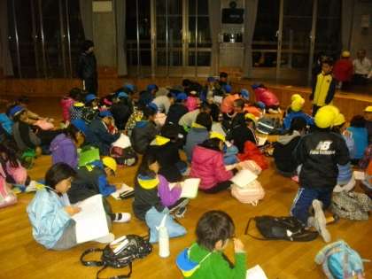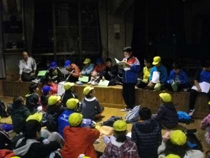 オリエンテーションホールで、一日の振り返りを行いました。けがもなく安全に過ごすことができたことや、協力して自然観察ラリーができたことは、とてもよかったと思います。明日の天候は、曇りのち雨との予報ですが、天狗杉までの登山を行う予定です。