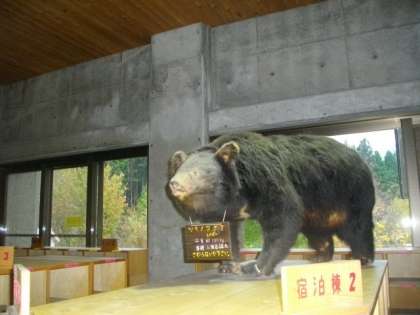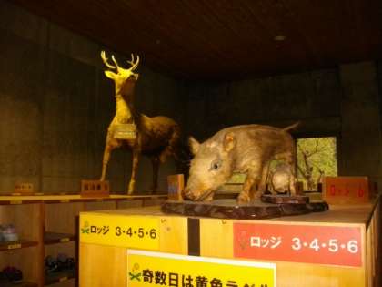 山の家の玄関の入口のところに靴箱があります。その上には3体の大きな剥製が子どもたちを迎えてくれています。