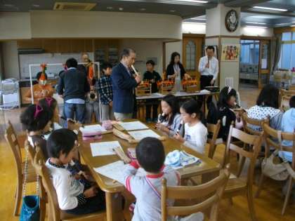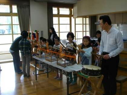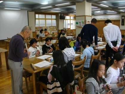 9日(土)午後1時30分から土曜学習「親子祇園囃子体験」をランチルームで開催しました。今年も月鉾保存会のみなさんにお世話になり,笛・太鼓・鉦の演奏体験をさせていただきました。