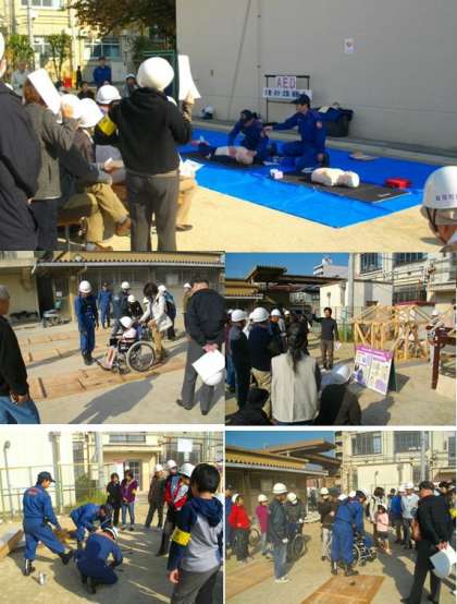 地域の防災訓練が,元待賢小学校で実施されました。9時に地震が発生したことを想定して町ごとに避難場所に集合し,そのあと,煙ハウス体験や車いす補助体験を行うなど,災害に備える活動が行われていました。