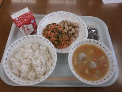 麦ごはん・牛乳・さけと大根葉のまぜごはんの具・とら豆の甘煮・いものこ汁