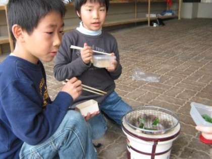 今日,3年生は昔の道具調べで,七輪を使って炭火をおこす体験学習をしました。うちわで扇ぎ,七輪の炭に漸く火がついたら,お餅を焼きます。今回は,学校の花壇で栽培していた「九条ねぎ」も一緒に焼きました。昨日見事に生長した九条ねぎの収穫をしたところです。炭火で焼くとねぎが甘くてとてもおいしかったです。体にもよい九条ねぎを食べることができて良かったですね。