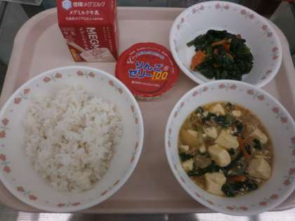 麦ごはん・牛乳・とうふのカレー煮・ほうれん草のいためナムル・りんごゼリー