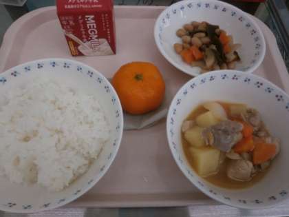 ごはん・牛乳・鶏肉と野菜の煮つけ・五目煮豆・みかん