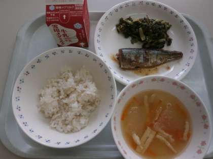 麦ごはん・牛乳・さんまのかわり煮・だいこん葉のごまいため・とうがんのくずひき
