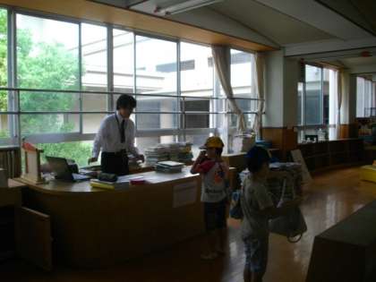 10時から図書の貸し出しを行いました。2階ワーキングスペースは,この夏,図書整備・レイアウト変更をしてリニューアルする予定です。今日は図書委員会のお友達が登校して,本の整備をしてくれました。