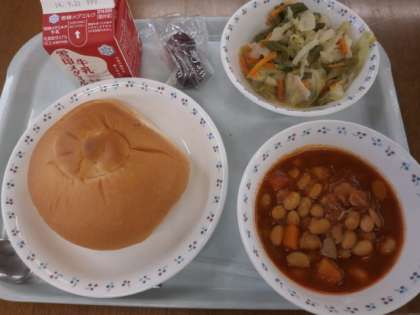 バターうずまきパン・牛乳・大豆と鶏肉のトマト煮・アスパラガスのソテー・ぶどう