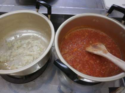 たまねぎを炒めて,皮をむいてきざんだトマトを入れて煮込みます。